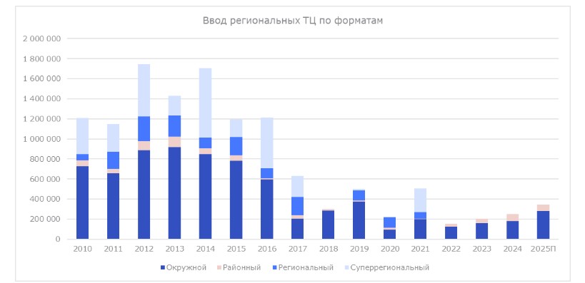 Рынок сохраняет потенциал роста, особенно в городах с дефицитом качественных ТЦ — Волгограде, Красноярске, Казани. В 2025 году ожидается ввод 361 тыс. кв. м, 39% из которых придётся на регионы. Основные тренды — компактные ТЦ в составе жилых проектов и редевелопмент устаревших площадей. Успех проектов будет зависеть от адаптации под локальные запросы, работы с арендаторами и конкурентоспособности на фоне онлайн-торговли. Региональные ТЦ всё больше становятся не только торговыми, но и социальными центрами.